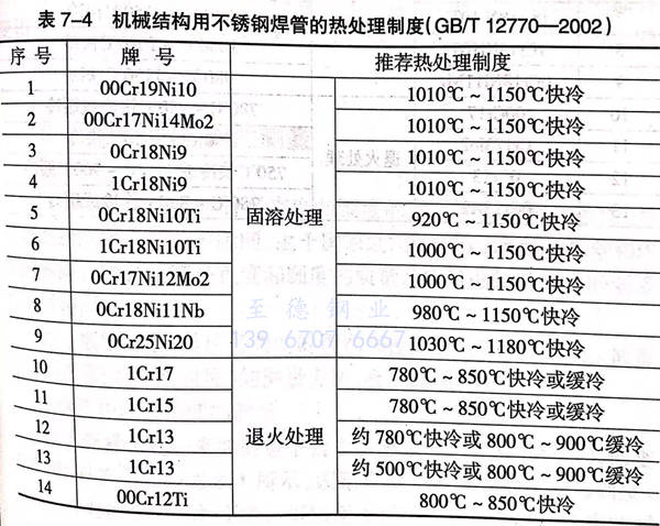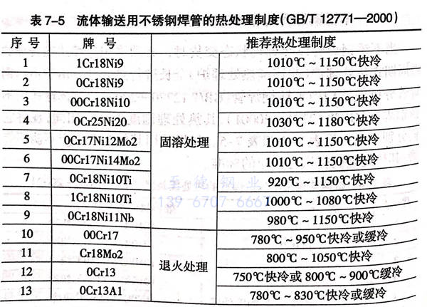 當不銹(xiu)(xiu)(xiu)鋼(gang)管以熱(re)處(chu)(chu)理(li)狀(zhuang)態(tai)交貨時,必(bi)須(xu)采用(yong)連續式(shi)熱(re)處(chu)(chu)理(li)爐(lu)或周期式(shi)熱(re)處(chu)(chu)理(li)爐(lu)(非(fei)連續熱(re)處(chu)(chu)理(li)爐(lu))全長進行(xing)熱(re)處(chu)(chu)理(li)。由于不銹(xiu)(xiu)(xiu)鋼(gang)焊管分機械結構用(yong)不銹(xiu)(xiu)(xiu)鋼(gang)焊管(GB/T 14976-2002)和(he)流體(ti)輸送用(yong)不銹(xiu)(xiu)(xiu)鋼(gang)管(GB/T 14975 -2002),其熱(re)處(chu)(chu)理(li)制度(du)不完全相同(tong),現將它們分別列出,見表(biao)7-4和(he)表(biao)7-5.如(ru)果采用(yong)其他(ta)標準(zhun)生產不銹(xiu)(xiu)(xiu)鋼(gang)焊管,其熱(re)處(chu)(chu)理(li)制度(du)執行(xing)相應的(de)標準(zhun)。