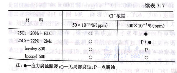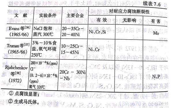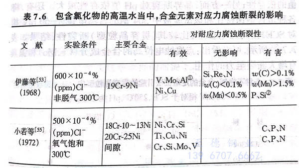 小若等(deng)(deng)(1972年)使(shi)用氧(yang)飽和狀態的(de)包含500x10-4%(ppm)氯離子(zi)在(zai)(zai)內(nei)的(de)高(gao)溫水(shui),研究(jiu)C、Si、Mn、P、S、Cu、Mo、Ti還有(you)氮對(dui)(dui)于18Cr-10~13Ni鋼(gang)(gang)以(yi)(yi)及20Cr-25Ni鋼(gang)(gang)的(de)應力腐蝕斷裂的(de)影(ying)響,結(jie)果(guo)表明:針對(dui)(dui)18Cr-10~13Ni鋼(gang)(gang)(single U-bend),C、P、N能(neng)(neng)夠(gou)顯著地提高(gao)其裂紋敏感(gan)性(xing),Ni、Cr、Si、Ti和Cu能(neng)(neng)夠(gou)在(zai)(zai)一(yi)定程(cheng)度(du)上降低(di)其敏感(gan)性(xing);另一(yi)方面,對(dui)(dui)于20Cr-25Ni鋼(gang)(gang)(double U-bend)來說,C、P、N仍然能(neng)(neng)夠(gou)提高(gao)其裂紋敏感(gan)性(xing),Ni、Cr、Si、Mo、V能(neng)(neng)夠(gou)在(zai)(zai)一(yi)定程(cheng)度(du)上降低(di)其敏感(gan)性(xing)。根據(ju)這些研究(jiu)結(jie)果(guo)開(kai)發出(chu)了0.02C-2Si-25Cr-25Ni-2.7 V鋼(gang)(gang),并通過使(shi)用氯離子(zi)500x10-4%(ppm)、300℃、非脫(tuo)氣的(de)高(gao)溫水(shui)進行1000h的(de)試驗(yan),確認沒有(you)斷裂發生(sheng)。將上述(shu)伊藤等(deng)(deng)、小若等(deng)(deng)有(you)關合金元素(su)影(ying)響的(de)試驗(yan)結(jie)果(guo)同日本(ben)國外的(de)實驗(yan)結(jie)果(guo)相比較,總結(jie)出(chu)表7.6.根據(ju)表7.6可以(yi)(yi)看出(chu):在(zai)(zai)高(gao)溫水(shui)中,除了鎳以(yi)(yi)外鉻也能(neng)(neng)夠(gou)有(you)效地增(zeng)(zeng)大斷裂阻(zu)力,這一(yi)點日本(ben)國內(nei)外的(de)意見是一(yi)致的(de);另外銅(tong)對(dui)(dui)于增(zeng)(zeng)大斷裂阻(zu)力也是很有(you)效的(de)。
