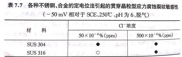 還(huan)有(you)(you),高(gao)張等(1972年)采用經過(guo)敏化處理(li)的(de)(de)5種(zhong)碳含量(liang)不同的(de)(de)市售(shou)鋼(gang)(304、304 L、304ELC、321、321L),在(zai)氯離子(10~100)x10-4%(ppm)、溫度300℃的(de)(de)非(fei)脫氣高(gao)溫水(shui)中(zhong)施加(jia)應(ying)力進行試驗,結(jie)果發(fa)現碳含量(liang)增(zeng)多時(晶界(jie))裂紋敏感性會提高(gao)。泊(bo)里(li)等(1980年)也以(yi)304不銹(xiu)鋼(gang)和316不銹(xiu)鋼(gang)為對(dui)象研究(jiu)它們(men)在(zai)高(gao)溫水(shui)(250℃、氯離子500x10-4%(ppm))中(zhong)發(fa)生應(ying)力腐(fu)蝕斷裂的(de)(de)電(dian)(dian)位(wei)-pH圖,結(jie)果認為:穿(chuan)晶裂紋對(dui)電(dian)(dian)位(wei)的(de)(de)依(yi)(yi)(yi)存性大(da)于對(dui)pH值(zhi)(zhi)的(de)(de)依(yi)(yi)(yi)存性;另一方面,晶界(jie)斷裂對(dui)pH值(zhi)(zhi)依(yi)(yi)(yi)存性很大(da)。還(huan)有(you)(you),將各種(zhong)市售(shou)鋼(gang)保持(chi)在(zai)和該試驗液中(zhong)304不銹(xiu)鋼(gang)的(de)(de)自(zi)然電(dian)(dian)位(wei)(-50mV相對(dui)SCE)相同的(de)(de)電(dian)(dian)位(wei)上,比較其(貫(guan)穿(chuan)晶粒型)斷裂性,結(jie)果如(ru)表(biao)7.7所示,可以(yi)看(kan)出(chu):點腐(fu)蝕電(dian)(dian)位(wei)高(gao)的(de)(de)合(he)金成分(Cr、Mo)和鎳具(ju)有(you)(you)增(zeng)大(da)斷裂阻(zu)力的(de)(de)作用。