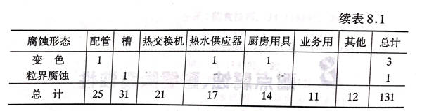鈍化膜的存在使不銹鋼維持其耐蝕性。在不銹鋼表面產生的局部集中腐蝕,最后形成孔狀的現象叫做點(dian)腐蝕,Uhlig(1940年)認為點腐蝕是導致鈍態破壞的原因。此外,在金屬/金屬之間、金屬/非金屬之間或附著物下出現縫隙時,縫隙的一部分或全部被腐蝕的現象叫縫(feng)隙腐蝕(shi)。在有機酸環境下也會出現這些腐蝕現象,在實際應用中,很多問題出現在以海水為代表的含有少量氯離子的環境中。正如第7章中圖7.1所示,在化學工廠中的腐蝕事例中,點腐蝕和縫隙腐蝕事例是繼應力腐蝕斷裂之后出現最頻繁的問題,特別是近幾年來不銹鋼的用途在水處理領域中不斷擴大,因此成為一個非常重要的問題。金子等人在1990年對處于水環境中的不銹鋼腐蝕事例進行了分析,表8.1是從其分析結果中摘錄的按用途和形態所作出的總計結果。根據表8.1,點腐蝕和縫隙腐蝕占總數的49%,此外如果把大氣中的生銹也看作從小孔開始,然后逐漸擴散,那么也可以把它看作為點腐蝕、縫隙腐蝕等局部腐蝕的一種,所以再加上大氣中的腐蝕,那54%的腐蝕都屬于這種腐蝕形態,它與應力腐蝕斷裂一起成為不銹鋼所面臨的重大問題。