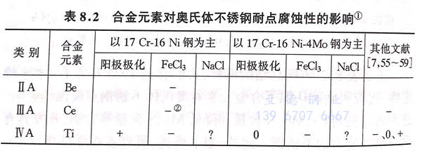 正(zheng)如表8.2所總(zong)結的(de)那樣,人(ren)們直(zhi)到(dao)1975年左右,才比較定性、比較明確地認識了(le)合(he)金(jin)元(yuan)素對奧氏體不銹(xiu)鋼點腐(fu)(fu)蝕(shi)(shi)的(de)影響(xiang)(xiang),進而通(tong)過提高Cr、Mo、N含量和降低Mn、S含量等方法,開發具(ju)有耐點腐(fu)(fu)蝕(shi)(shi)能(neng)力的(de)不銹(xiu)鋼。此(ci)外,如下所述,研究者在詳細探討鉻、鎳(nie)、鉬、銅、氮等元(yuan)素的(de)影響(xiang)(xiang)同時,漸漸轉為研究合(he)金(jin)元(yuan)素對縫隙腐(fu)(fu)蝕(shi)(shi)的(de)影響(xiang)(xiang)。