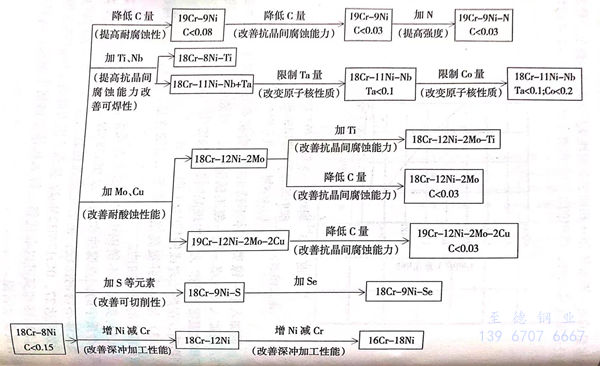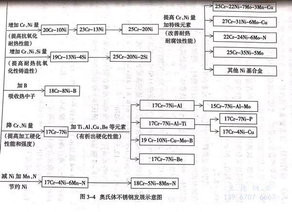 式中各元素(su)符號(hao)分別(bie)表示該元素(su)在鋼中的質(zhi)量(liang)百分數含量(liang)。在18-8鋼基(ji)礎上,奧氏體不銹鋼的發展(zhan)變化過(guo)程見圖3-4。