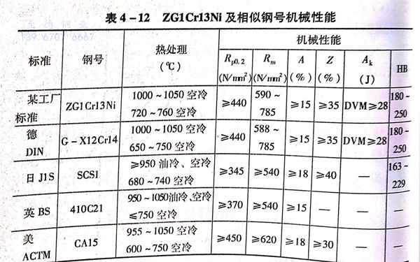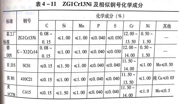 ZG1Cr13Ni及國外一些相似材料的成分(fen)和性(xing)能(neng)標準參(can)見(jian)表 4-11 和 表 4-12。