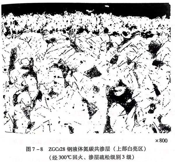 由于合金(jin)元素的影響(xiang),與碳鋼相比,在相同條件下不銹鋼氮碳共(gong)滲層硬度(du)更(geng)高,但滲層深度(du)淺,硬度(du)變(bian)化梯(ti)度(du)大,見圖7-7。圖7-8是ZGCr28的氮碳共(gong)滲組織(zhi)圖。