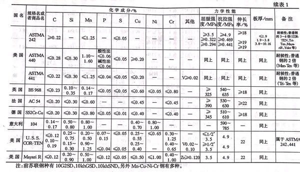 以提高耐候性作為目的所添加的合金元素因為一般也是鋼的強化元素,所以調節其添加量或者通過進行淬火、退火可以改變鋼的強度。現在市售的耐候鋼的強度如表1所示,490 MPa(50kg/m㎡)級是主體,可是也開發了392 MPa(40kg/m㎡)級以及588 MPa(60kg/m㎡)級。另外,強度686MPa(70kg/m㎡)級以上的高強度鋼已經添加了多量的強化合金元素,必然成為耐候性兼備的鋼種,所以可以把任意強度的耐候鋼作為焊接結構鋼使用。