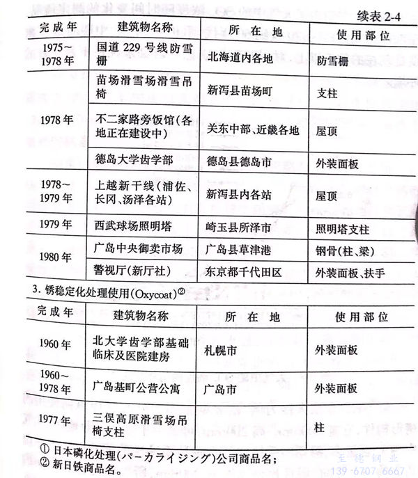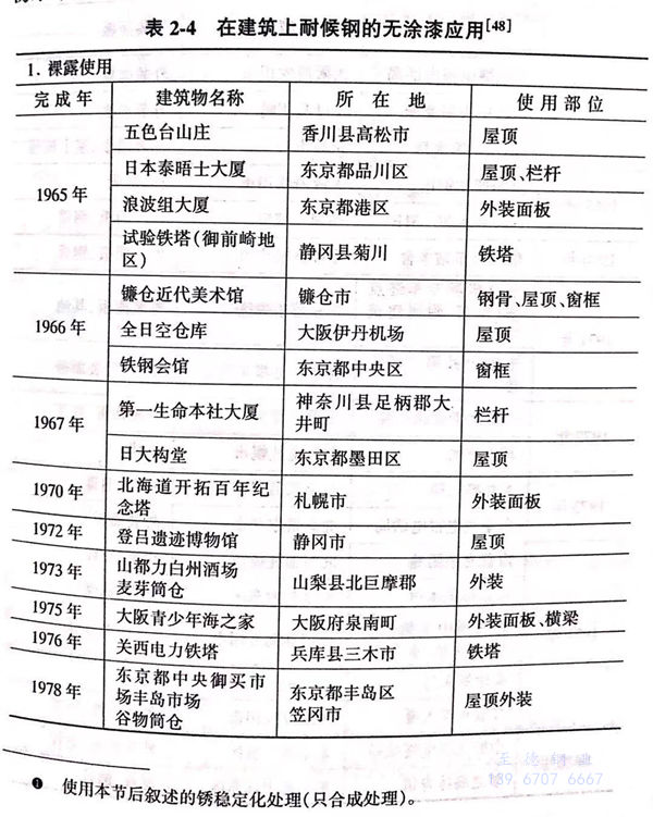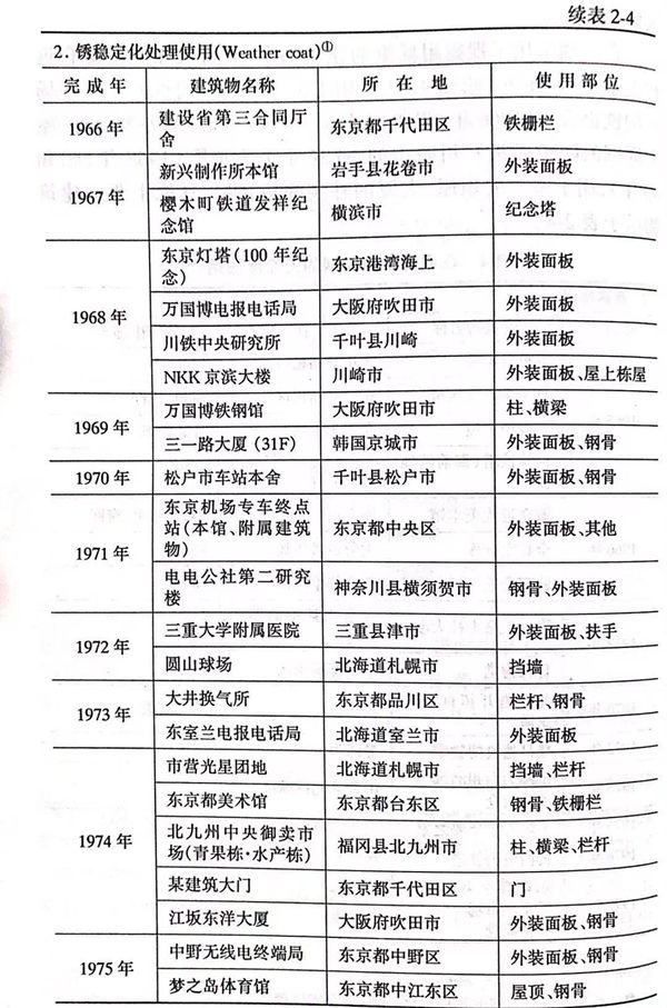 在初期采用(yong)(yong)了裸露耐(nai)候(hou)鋼的(de)(de)(de)建(jian)(jian)筑物(wu)中,人(ren)所共知的(de)(de)(de)是鐮倉近代美術館(guan)(1966年(昭和(he)41年),用(yong)(yong)于鋼骨(gu)、屋(wu)頂、窗框)、東京茅場(chang)町的(de)(de)(de)鐵鋼會館(guan)(1966年(昭和(he)41年),用(yong)(yong)于欄桿、部分外裝面(mian)板(ban)、屋(wu)上周(zhou)圍(wei)的(de)(de)(de)防護面(mian)板(ban))、川崎市的(de)(de)(de)NKK京濱大廈(1968年(昭和(he)43年),用(yong)(yong)于屋(wu)上的(de)(de)(de)頂屋(wu)、大廈的(de)(de)(de)外裝面(mian)板(ban))等。其他主要(yao)的(de)(de)(de)建(jian)(jian)筑物(wu)示于表2-4。