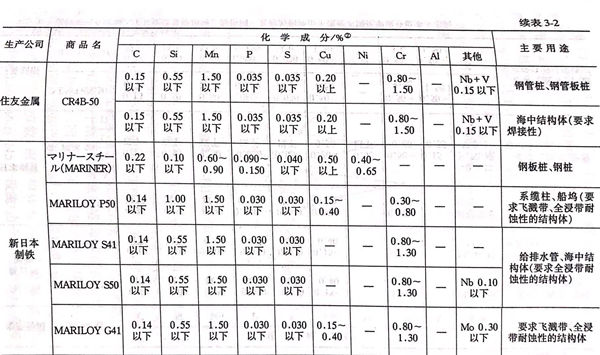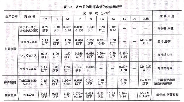 這些鋼(gang)種的(de)(de)(de)開(kai)發,到1970年(nian)代初期(qi)(昭和(he)46~47年(nian))基(ji)本(ben)(ben)結束,各公(gong)司開(kai)始生產(chan)(chan)銷售。表(biao)3-2示出(chu)了日本(ben)(ben)現在(zai)正在(zai)生產(chan)(chan)的(de)(de)(de)耐(nai)海水鋼(gang)。1973年(nian)出(chu)版的(de)(de)(de)鋼(gang)材(cai)俱樂部的(de)(de)(de)“關于鋼(gang)材(cai)的(de)(de)(de)腐蝕防蝕的(de)(de)(de)資料”中,用(yong)表(biao)給(gei)出(chu)的(de)(de)(de)“日本(ben)(ben)國內(nei)各鋼(gang)鐵公(gong)司的(de)(de)(de)耐(nai)海水鋼(gang)的(de)(de)(de)規格(ge)”常常被(bei)引用(yong),表(biao)3-2是以此為基(ji)礎(chu)參(can)考文(wen)獻追加了以后的(de)(de)(de)鋼(gang)種制成(cheng)的(de)(de)(de)。與耐(nai)候鋼(gang)不同成(cheng)分系相(xiang)當多,還沒有成(cheng)為JIS標準。