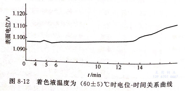 隨(sui)著(zhu)著(zhu)色(se)液(ye)溫度(du)的(de)(de)(de)升高(gao),離子的(de)(de)(de)擴散速(su)率加(jia)快(kuai),從(cong)而加(jia)速(su)著(zhu)色(se)的(de)(de)(de)形成。但(dan)著(zhu)色(se)液(ye)溫度(du)過(guo)高(gao),如在90℃以上,會(hui)使溶(rong)液(ye)中的(de)(de)(de)水分蒸發,改變著(zhu)色(se)液(ye)的(de)(de)(de)成分。著(zhu)色(se)液(ye)溫度(du)過(guo)低,如在70℃以下,會(hui)明顯降低著(zhu)色(se)膜(mo)的(de)(de)(de)形成速(su)率。見(jian)圖8-12,當著(zhu)色(se)液(ye)溫度(du)為(60±5)℃,著(zhu)色(se)起色(se)點推遲,使著(zhu)色(se)膜(mo)的(de)(de)(de)色(se)彩不均勻。