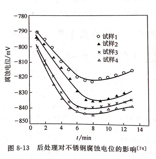 后處理對著色表(biao)面耐蝕性的(de)影響見(jian)圖8-13。在0.2mol/L鹽酸溶(rong)液中,測定(ding)下列4種試(shi)樣的(de)腐蝕電(dian)位,以(yi)評(ping)定(ding)其(qi)耐蝕性。