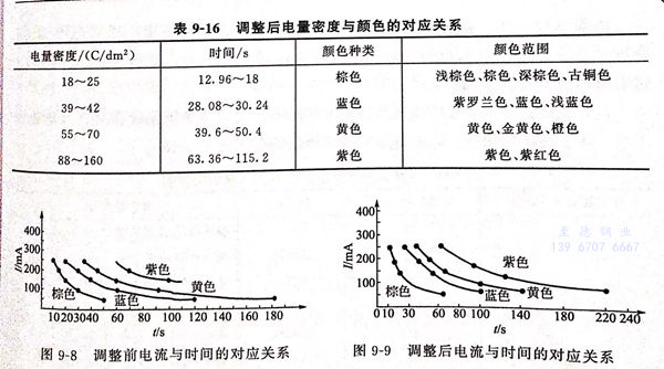 見圖(tu)9-7,由圖(tu)可見,每一種顏(yan)色(se)(se)的(de)(de)電流與時間大致呈反比(bi)例關系。實驗發現(xian),每一個(ge)試樣上,只(zhi)要達到一定(ding)的(de)(de)電量密度,就(jiu)會出現(xian)不同(tong)的(de)(de)顏(yan)色(se)(se),就(jiu)可采用控制電量來(lai)達到不銹鋼(gang)著色(se)(se)的(de)(de)目的(de)(de)。