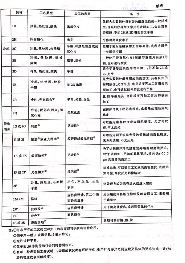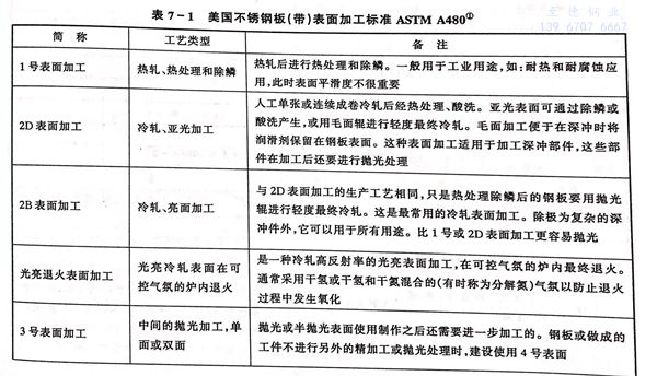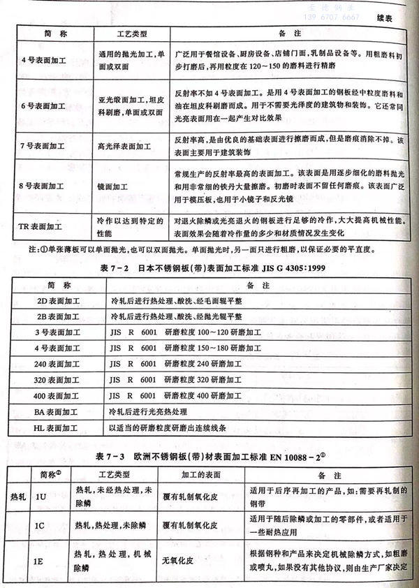 表7-1至表7-3顯示出了有關(guan)標(biao)準中的(de)(de)許多種板材的(de)(de)表面(mian)加工(gong)。其中大量應(ying)用(yong)的(de)(de)是2B或(huo)2R(有時稱為BA或(huo)2BA)和4號表面(mian)加工(gong)。