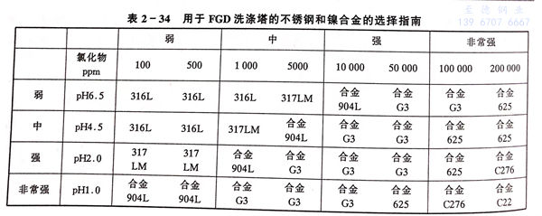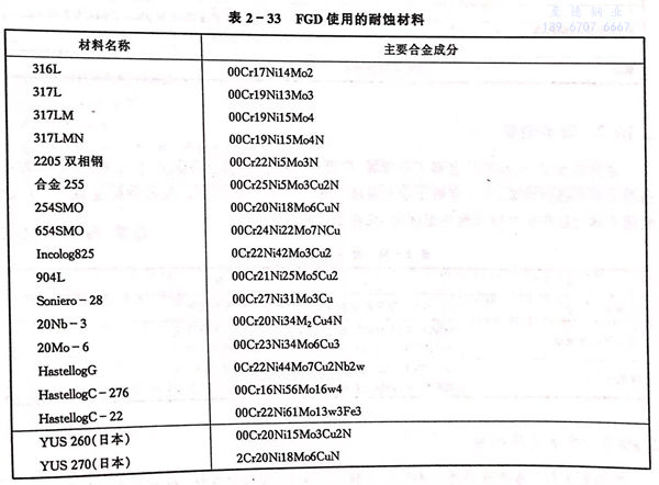 在煙氣脫硫裝置中所使用的耐蝕材料涉及到一般不銹(xiu)鋼、高性能不銹鋼以及鎳基耐蝕合金,見表2-33.可根據介質條件進行合理選擇。通常按表2-34所列原則選擇煙氣脫硫不同裝置的耐蝕材料。