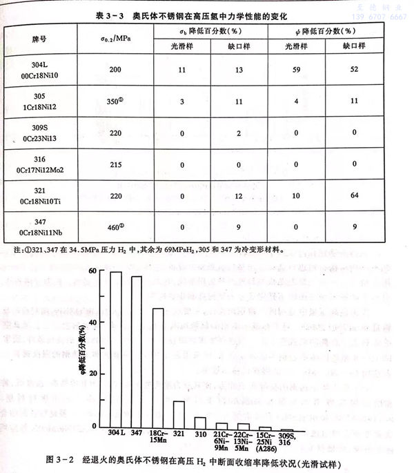 在高壓氫中,一些不(bu)銹鋼的性能變化結果見表3-2、表3-3和圖3-2.