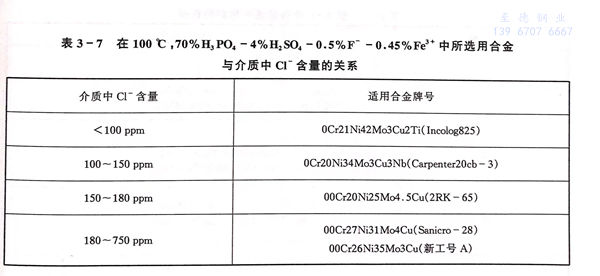 在磷肥生產中,廣泛使用價格便宜的濕法磷酸,這種磷酸含有F-、CI-、SO2-4、Fe3+、Al3+、Mg2+等,除Fe3+外均有加速不銹鋼腐蝕的作用,其中Cl-、F-尤為強烈。大量的研究表明,在濕法磷酸環境中,高鉻、鉬的奧氏體不銹鋼較為適用。在實際生產中,濕法磷酸中的F-約為0.5%,氯離子的含量卻在較大范圍內變動。因此濕法磷酸中的耐蝕材料選擇主要受介質溫度和Cl-含量的控制。在90℃,含100ppm Cl-的濕法磷酸中,含2%~4%Mo的0Cr17Ni12Mo2、00Cr17Ni14Mo2、0Cr19Ni13Mo3、00Cr19Ni13Mo3的腐蝕率為0.15mm/a,屬可用范圍,見圖3-7。隨溫度的提高和介質中Cl-含量的增加,此類不銹鋼已不具備足夠耐蝕性。一些材料在濕法磷酸中選擇與介質Cl-含量的關系見表3-7。