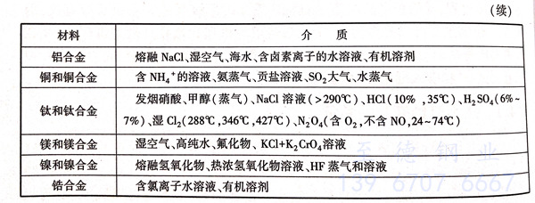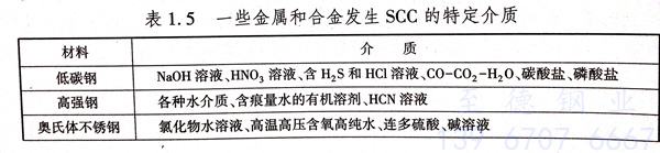 只(zhi)有(you)(you)在(zai)特(te)定(ding)的(de)(de)腐(fu)(fu)蝕(shi)(shi)介(jie)質(zhi)中含(han)有(you)(you)某些對發生應力(li)腐(fu)(fu)蝕(shi)(shi)有(you)(you)特(te)效作用(yong)的(de)(de)離(li)子(zi)、分(fen)子(zi)時(shi)才會發生應力(li)腐(fu)(fu)蝕(shi)(shi)。這種(zhong)特(te)定(ding)的(de)(de)腐(fu)(fu)蝕(shi)(shi)劑并不一定(ding)要大(da)量存在(zai),而(er)且往往濃度很低(di)。表(biao)1.5列(lie)出了一些金(jin)(jin)屬和合金(jin)(jin)發生應力(li)腐(fu)(fu)蝕(shi)(shi)的(de)(de)特(te)定(ding)介(jie)質(zhi)。