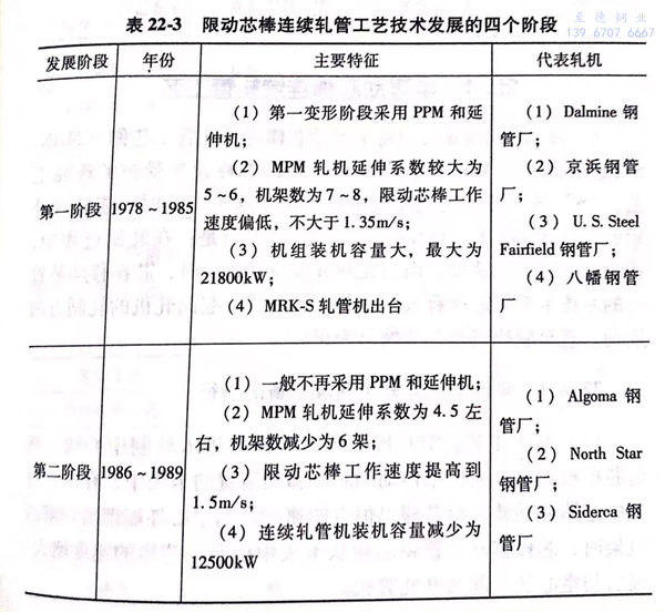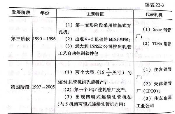 不(bu)銹鋼(gang)管(guan)(guan)限(xian)動芯(xin)(xin)棒連(lian)(lian)軋(ya)管(guan)(guan)工(gong)藝的技(ji)術(shu)發展(zhan)史(shi)應(ying)溯自1890年(nian),Pfeiffer在(zai)一(yi)篇文章中寫道(dao):“1890年(nian)發明(ming)家Heckert 申請了連(lian)(lian)軋(ya)技(ji)術(shu)專利(li)(li),該技(ji)術(shu)采用十(shi)架(jia)兩輥(gun)高速軋(ya)機(ji)(ji)固定(ding)芯(xin)(xin)棒軋(ya)制(zhi)空心(xin)管(guan)(guan)坯。可見在(zai)Calmes 多機(ji)(ji)架(jia)軋(ya)管(guan)(guan)機(ji)(ji)問世前80年(nian),就已有了雛形。”1968年(nian)A.H.Calmes 取得了MPM連(lian)(lian)軋(ya)管(guan)(guan)工(gong)藝的權(quan)利(li)(li),10年(nian)后(hou),第(di)一(yi)套(tao)MPM連(lian)(lian)軋(ya)管(guan)(guan)機(ji)(ji)在(zai)Dalmine Bergamo 鋼(gang)管(guan)(guan)廠投(tou)產,到(dao)2003年(nian)12月天津無(wu)縫不(bu)銹鋼(gang)管(guan)(guan)廠三輥(gun)式限(xian)動芯(xin)(xin)棒連(lian)(lian)軋(ya)管(guan)(guan)機(ji)(ji)投(tou)產,已經(jing)歷(li)了整(zheng)整(zheng)25年(nian)的時間,和全(quan)浮動芯(xin)(xin)棒連(lian)(lian)軋(ya)管(guan)(guan)技(ji)術(shu)的發展(zhan)相比,這(zhe)種工(gong)藝技(ji)術(shu)的發展(zhan)顯(xian)得快多了。這(zhe)25年(nian)的發展(zhan)歷(li)程(cheng)可劃分為四(si)個階段,如表(biao)22-3所示(shi)。