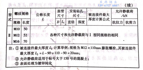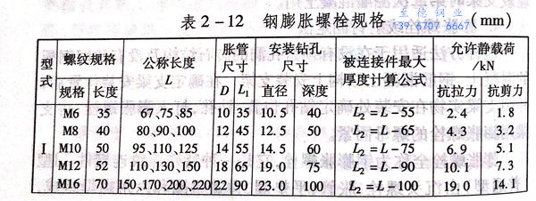 膨脹(zhang)(zhang)螺(luo)(luo)(luo)(luo)(luo)(luo)栓(shuan)全稱為鋼膨脹(zhang)(zhang)螺(luo)(luo)(luo)(luo)(luo)(luo)栓(shuan),它是一種特殊螺(luo)(luo)(luo)(luo)(luo)(luo)紋(wen)連(lian)接(jie)(jie)件(jian)(jian)(jian)。型(xing)(普通型(xing))由沉頭螺(luo)(luo)(luo)(luo)(luo)(luo)栓(shuan)、脹(zhang)(zhang)管、平(ping)墊圈(quan)、彈(dan)簧(huang)墊圈(quan)和六角螺(luo)(luo)(luo)(luo)(luo)(luo)母(mu)組成,如圖2-26所(suo)示。使用時先用沖擊鉆(zhan)(zhan)在(zai)安(an)裝位(wei)置(zhi)鉆(zhan)(zhan)一個相應尺(chi)寸(cun)的(de)孔(kong)(kong),鉆(zhan)(zhan)成的(de)孔(kong)(kong)必須與構(gou)件(jian)(jian)(jian)表面垂直,并將(jiang)孔(kong)(kong)內(nei)碎屑清(qing)除干凈(jing)。再把(ba)螺(luo)(luo)(luo)(luo)(luo)(luo)栓(shuan)、脹(zhang)(zhang)管裝人孔(kong)(kong)中,然后依(yi)次把(ba)構(gou)件(jian)(jian)(jian)(或(huo)設(she)備)平(ping)墊圈(quan)、彈(dan)簧(huang)墊圈(quan)套(tao)在(zai)螺(luo)(luo)(luo)(luo)(luo)(luo)栓(shuan)上面,最后旋緊(jin)螺(luo)(luo)(luo)(luo)(luo)(luo)母(mu),在(zai)旋緊(jin)螺(luo)(luo)(luo)(luo)(luo)(luo)母(mu)的(de)同時把(ba)螺(luo)(luo)(luo)(luo)(luo)(luo)栓(shuan)逐(zhu)漸拔(ba)起,螺(luo)(luo)(luo)(luo)(luo)(luo)栓(shuan)底部呈錐(zhui)形,將(jiang)脹(zhang)(zhang)管逐(zhu)步脹(zhang)(zhang)開與周圍(wei)磚體或(huo)混凝土固(gu)緊(jin),使螺(luo)(luo)(luo)(luo)(luo)(luo)栓(shuan)、脹(zhang)(zhang)管、螺(luo)(luo)(luo)(luo)(luo)(luo)母(mu)、構(gou)件(jian)(jian)(jian)(或(huo)設(she)備)與墻體連(lian)接(jie)(jie)成一個整(zheng)體。I型(xing)不(bu)同之處是將(jiang)沉頭螺(luo)(luo)(luo)(luo)(luo)(luo)栓(shuan)分成螺(luo)(luo)(luo)(luo)(luo)(luo)栓(shuan)和錐(zhui)形螺(luo)(luo)(luo)(luo)(luo)(luo)母(mu)兩個零件(jian)(jian)(jian),可以(yi)安(an)裝大型(xing)機器、設(she)備,使用方法與I型(xing)相同。鋼膨脹(zhang)(zhang)螺(luo)(luo)(luo)(luo)(luo)(luo)栓(shuan)規(gui)格見表2-12。