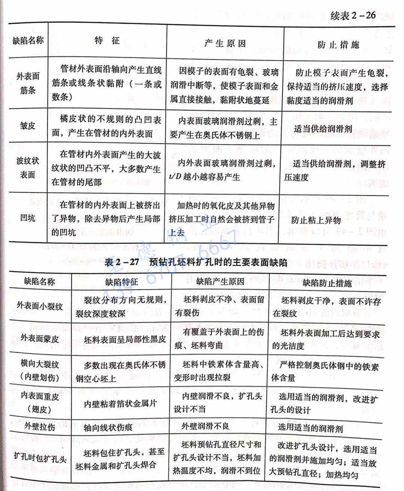 的主要表面缺陷,表2-27為預鉆孔坯料擴孔時的主要表面缺陷。