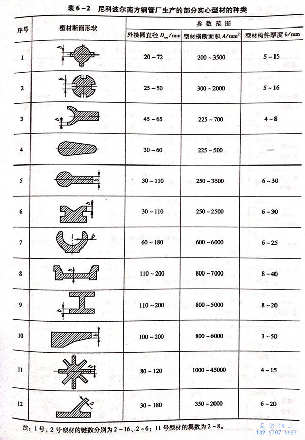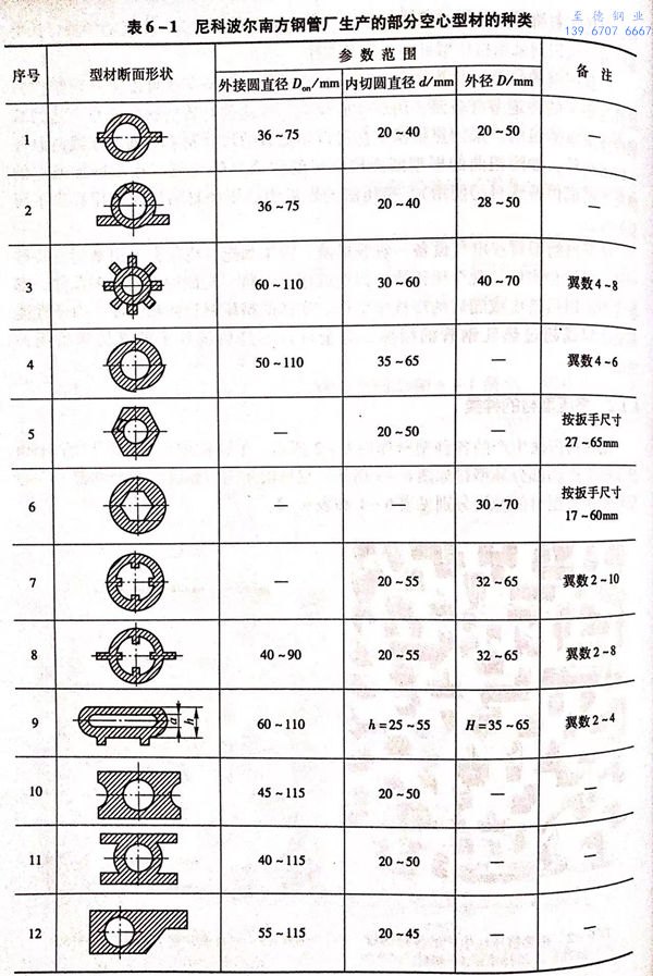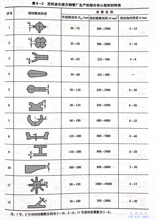 用熱擠壓法生產的各種型材如圖6-2所示。尼科波爾南方不銹鋼管廠的3150噸擠壓機生產的部分異型材如圖6-3所示。尼科波爾南方不銹鋼管廠生產的部分空心型材和實心型材的種類分別見表6-1和表6-2。