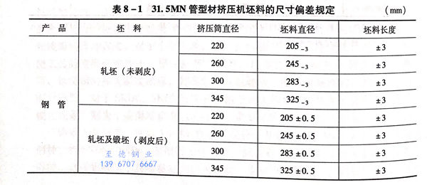 軋坯(pi)及(ji)鍛坯(pi)未剝皮(pi)和經剝皮(pi)后偏差(cha)均為±3.0mm。31.5MN(3150t)擠壓機用于管材(cai)、棒材(cai)及(ji)型材(cai)生產時對其坯(pi)料尺(chi)寸偏差(cha)的規定見(jian)表8-1.