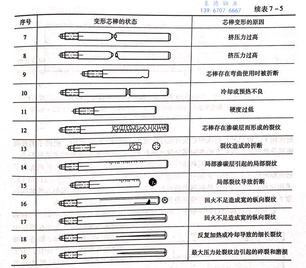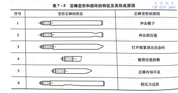 表7-5中列出(chu)了使用在(zai)15MN(1500t)和25MN(2500t)臥(wo)式擠壓機上的(de)中等尺(chi)寸芯棒的(de)幾種變形(xing)和損壞的(de)特(te)征。