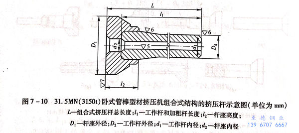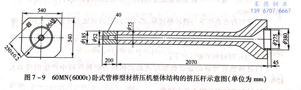 圖(tu)7-9所示(shi)為60MN(6000t)臥式管棒型材擠(ji)壓(ya)(ya)機(ji)整體結構的擠(ji)壓(ya)(ya)桿。圖(tu)7-10所示(shi)為31.5MN(3150t)臥式管棒型材擠(ji)壓(ya)(ya)機(ji)組合式結構的擠(ji)壓(ya)(ya)桿。