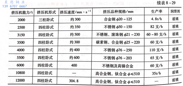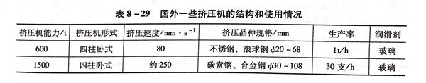 表(biao)8-29中(zhong)所列是國外一(yi)些(xie)擠壓機的結(jie)構及(ji)使用情況,可(ke)以看出,臥(wo)式(shi)液壓擠壓機中(zhong),四(si)柱式(shi)使用得比較普遍,且擠壓機上都(dou)具有(you)內置式(shi)穿孔系統的結(jie)構,同時可(ke)以生產不銹(xiu)鋼管、棒、型材。