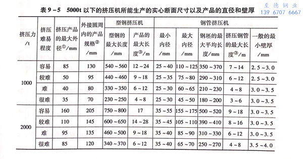 各種噸位擠壓機生產的普通碳素鋼管和不銹鋼管的產品規格見表9-6.