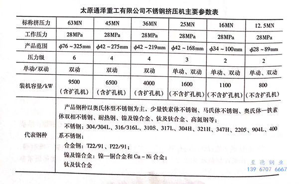 太原通澤重工有限公司設計制造的36MN不(bu)銹鋼管熱擠(ji)壓生產線于2010年8月21日在常熟華新特殊鋼有限公司熱試擠壓成功并投入使用。該生產線采用ф170mm、φ210mm、φ270mm、φ345mm擠壓筒系統,成功擠出φ51mm×4mm~ф244mm×20mm等數十種規格的鋼管產品,材質范圍覆蓋了“300系列”不銹鋼及904L不銹鋼(gang)、800合金(jin)、811、825合金、UNSS92108 高氮鋼等特種合金和鈦合金。該生產線解決了以往穿孔機組無法涉及的材質領域,為擴大產品范圍提供了有力的平臺,對提高我國核電工業、石油化工、航空航天、艦船等特殊領域用管的質量具有積極的促進作用。