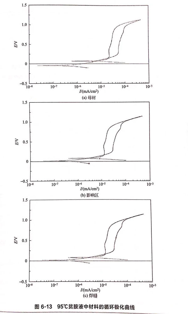 圖6-13是在(zai)貧胺液中(zhong)測得的材(cai)料(liao)的循環極(ji)化曲線,得到的擊破電位(wei)、保護電位(wei)和自腐蝕電位(wei)數值(zhi)列在(zai)表6-5中(zhong)。