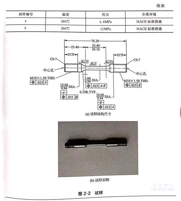 以S32168不(bu)銹鋼(gang)為試驗材料,材料的化學成分列于表2-1。試樣加工成標距為25.4mm、直徑為5.00mm的圓柱狀,試樣幾何形狀如圖2-2(a)所示,實物如圖2-2(b)所示。試驗之前,試樣先用400#、200#、2000#三種不同規格的砂紙依次沿著縱向和橫向交替打磨。打磨完成后,將試樣依次放入乙醇和丙酮溶液中進行超聲清洗,用去離子水沖洗并且吹干。試驗溶液用NACE標準中規定的分析純氯化鈉、乙酸和去離子水配制,其中氯化鈉的質量分數為5%,乙酸的質量分數為0.5%,溶液的pH值在3~4之間,試樣編號及試驗參數見表2-2.試驗是在美國CORT-EST公司研制的慢應變速率應力腐蝕試驗機上進行的,拉伸速率為1.9×10-6s-1.每次試驗結束,都會得到一條應力-應變曲線和斷裂時間,隨之可以得到最大應力、斷面收縮率和伸長率。將拉斷的試樣先后用去離子水和乙醇清洗并吹干,用掃描電鏡(SEM)觀察斷口形貌,然后將樣品沿標距段縱剖,觀察裂紋路徑及深度方向的生長情況。