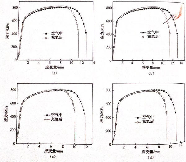 比較同一熱(re)處理溫度下未(wei)充(chong)(chong)氫試(shi)樣(yang)與充(chong)(chong)氫試(shi)樣(yang)的(de)拉(la)伸曲(qu)線,所有試(shi)樣(yang)充(chong)(chong)氫后拉(la)伸伸長(chang)量較未(wei)充(chong)(chong)氫時明顯下降(jiang),1050℃試(shi)樣(yang)下降(jiang)1.65mm,且隨溫度的(de)升高,伸長(chang)率的(de)差變大,1200℃的(de)試(shi)樣(yang)伸長(chang)率已經下降(jiang)1.76mm。