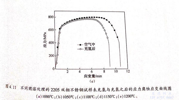 2205雙(shuang)相不銹鋼(gang)未充氫后在0.5mol/L H2SO4溶液應力腐蝕拉伸參數如表4.4所列,由表4.4可知,不同固溶溫度處理后的雙相不銹鋼具有不同的應力腐蝕參數。