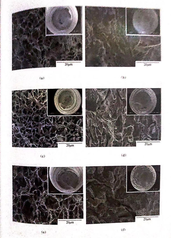 慢應變拉(la)伸(shen)斷(duan)(duan)裂(lie)后(hou)的雙相(xiang)不(bu)銹(xiu)鋼的斷(duan)(duan)口(kou)形貌(mao)如圖4.14所(suo)示。所(suo)有(you)(you)充氫拉(la)伸(shen)試樣(yang)斷(duan)(duan)口(kou)形貌(mao)與未充氫拉(la)伸(shen)試樣(yang)端口(kou)形貌(mao)呈現(xian)明(ming)(ming)顯(xian)(xian)區(qu)別(bie),所(suo)有(you)(you)未充氫拉(la)伸(shen)試樣(yang)斷(duan)(duan)口(kou)均出現(xian)明(ming)(ming)顯(xian)(xian)的頸(jing)縮(suo),且(qie)斷(duan)(duan)口(kou)平滑(hua),呈現(xian)典型的韌(ren)性(xing)斷(duan)(duan)裂(lie)特(te)(te)征。充氫拉(la)伸(shen)試樣(yang)斷(duan)(duan)口(kou)邊緣不(bu)規則,且(qie)沒有(you)(you)出現(xian)明(ming)(ming)顯(xian)(xian)的頸(jing)縮(suo),呈現(xian)脆性(xing)斷(duan)(duan)裂(lie)特(te)(te)征。