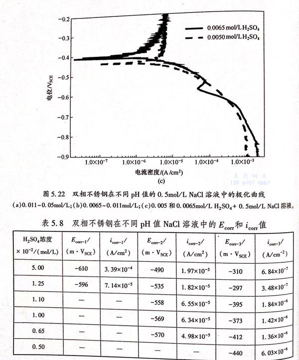 通過改變溶液的硫酸濃度來研究pH值的變化對雙相不銹鋼在H2SO4+0.5mol/L NaCl中的腐蝕行為的影響。圖5.22是不同硫酸濃度條件下雙相不銹鋼在H2SO4+0.5mol/L NaCl溶液中的極化曲線,從極化曲線中擬合的自腐蝕電位和腐蝕電流密度的值列于表5.8中。從圖5.8中可以看出,pH值對雙相不銹鋼在NaCI溶液中的腐蝕行為有顯著影響,并且可以改變自腐蝕電位的個數,當硫酸濃度大于0.011mol/L時出現三個自腐蝕電位,如圖5.22(a)所示;當硫酸濃度介于0.0065~0.011mol/L之間時出現兩個自腐蝕電位,如圖5.22b)所示;當硫酸濃度降低到0.005mol/L時只有一個自腐蝕電位,如圖5.22c)所示。