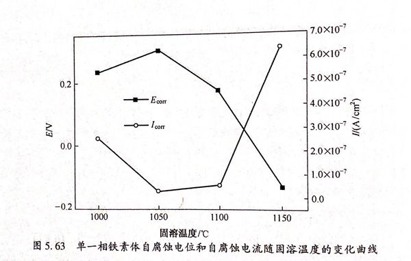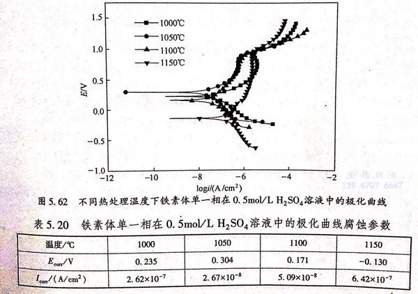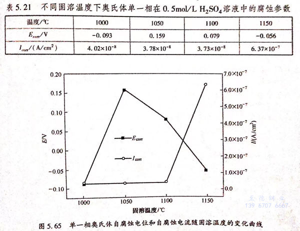 圖(tu)5.66為不同(tong)(tong)固(gu)溶(rong)(rong)(rong)(rong)(rong)溫(wen)度(du)下(xia)素(su)體單(dan)(dan)(dan)(dan)一(yi)相(xiang)與(yu)奧(ao)氏(shi)體單(dan)(dan)(dan)(dan)一(yi)相(xiang)在(zai)硫酸(suan)溶(rong)(rong)(rong)(rong)(rong)液(ye)中(zhong)(zhong)耐蝕(shi)(shi)性能(neng)的(de)(de)(de)對比圖(tu),從圖(tu)中(zhong)(zhong)可以看出,固(gu)溶(rong)(rong)(rong)(rong)(rong)溫(wen)度(du)較(jiao)(jiao)(jiao)低時(shi),鐵(tie)素(su)體單(dan)(dan)(dan)(dan)一(yi)相(xiang)自(zi)腐(fu)(fu)蝕(shi)(shi)電(dian)位(wei)較(jiao)(jiao)(jiao)高(gao)。隨(sui)著溫(wen)度(du)的(de)(de)(de)升(sheng)高(gao),兩(liang)相(xiang)自(zi)腐(fu)(fu)蝕(shi)(shi)電(dian)位(wei)差值變(bian)小(xiao),當固(gu)溶(rong)(rong)(rong)(rong)(rong)溫(wen)度(du)為1150℃時(shi),奧(ao)氏(shi)體單(dan)(dan)(dan)(dan)一(yi)相(xiang)自(zi)腐(fu)(fu)蝕(shi)(shi)電(dian)位(wei)較(jiao)(jiao)(jiao)鐵(tie)素(su)體單(dan)(dan)(dan)(dan)一(yi)相(xiang)略微提高(gao)。比較(jiao)(jiao)(jiao)不同(tong)(tong)固(gu)溶(rong)(rong)(rong)(rong)(rong)溫(wen)度(du)下(xia)的(de)(de)(de)兩(liang)相(xiang)的(de)(de)(de)自(zi)腐(fu)(fu)蝕(shi)(shi)電(dian)流可以發現(xian)(xian),奧(ao)氏(shi)體單(dan)(dan)(dan)(dan)一(yi)相(xiang)與(yu)鐵(tie)素(su)體單(dan)(dan)(dan)(dan)一(yi)相(xiang)的(de)(de)(de)自(zi)腐(fu)(fu)蝕(shi)(shi)電(dian)流在(zai)不同(tong)(tong)固(gu)溶(rong)(rong)(rong)(rong)(rong)溫(wen)度(du)下(xia)都相(xiang)差很小(xiao)。相(xiang)對在(zai)3.5%NaCl溶(rong)(rong)(rong)(rong)(rong)液(ye),鐵(tie)素(su)體單(dan)(dan)(dan)(dan)一(yi)相(xiang)在(zai)0.5mol 硫酸(suan)溶(rong)(rong)(rong)(rong)(rong)液(ye)中(zhong)(zhong)的(de)(de)(de)腐(fu)(fu)蝕(shi)(shi)速率有(you)了很明(ming)顯(xian)(xian)的(de)(de)(de)增(zeng)加,這(zhe)(zhe)說(shuo)明(ming)在(zai)0.5mol 硫酸(suan)溶(rong)(rong)(rong)(rong)(rong)液(ye)中(zhong)(zhong),鐵(tie)素(su)體單(dan)(dan)(dan)(dan)一(yi)相(xiang)與(yu)奧(ao)氏(shi)體單(dan)(dan)(dan)(dan)一(yi)相(xiang)都表現(xian)(xian)出了較(jiao)(jiao)(jiao)大的(de)(de)(de)腐(fu)(fu)蝕(shi)(shi)活性,在(zai)宏觀上表現(xian)(xian)出均勻(yun)腐(fu)(fu)蝕(shi)(shi)的(de)(de)(de)性質,其(qi)在(zai)0.5mol/L 硫酸(suan)溶(rong)(rong)(rong)(rong)(rong)液(ye)中(zhong)(zhong)的(de)(de)(de)優先(xian)腐(fu)(fu)蝕(shi)(shi)行為不明(ming)顯(xian)(xian),這(zhe)(zhe)與(yu)其(qi)在(zai)3.5%NaCl溶(rong)(rong)(rong)(rong)(rong)液(ye)中(zhong)(zhong)的(de)(de)(de)優先(xian)腐(fu)(fu)蝕(shi)(shi)行為明(ming)顯(xian)(xian)不同(tong)(tong)。