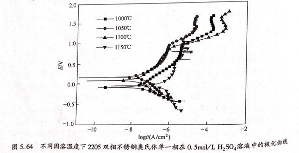圖5.64為不同固溶溫度下2205 雙(shuang)相(xiang)(xiang)不銹鋼奧(ao)氏(shi)體(ti)(ti)(ti)單一(yi)相(xiang)(xiang)在(zai)0.5mol/L 硫酸(suan)溶液中的(de)極化(hua)曲(qu)線,奧(ao)氏(shi)體(ti)(ti)(ti)單一(yi)相(xiang)(xiang)極化(hua)曲(qu)線形狀與鐵素體(ti)(ti)(ti)單一(yi)相(xiang)(xiang)相(xiang)(xiang)似,均沒(mei)有雙(shuang)相(xiang)(xiang)不銹鋼整體(ti)(ti)(ti)在(zai)0.5mml/1.1,50,溶液中出現的(de)法化(hua)鈍化(hua)區(qu)以及很寬(kuan)的(de)純化(hua)區(qu)間。當固溶溫度較低時,剪氏(shi)體(ti)(ti)(ti)單一(yi)相(xiang)(xiang)極化(hua)曲(qu)線靠近(jin)圖的(de)左上方(fang),隨著固溶溫度的(de)升高(gao),曲(qu)線向右下方(fang)移動(dong),其具體(ti)(ti)(ti)批合(he)數據如表5.20折列,自腐蝕電位和自腐蝕電流(liu)隨溫度的(de)變化(hua)曲(qu)線如圖5.65所示。