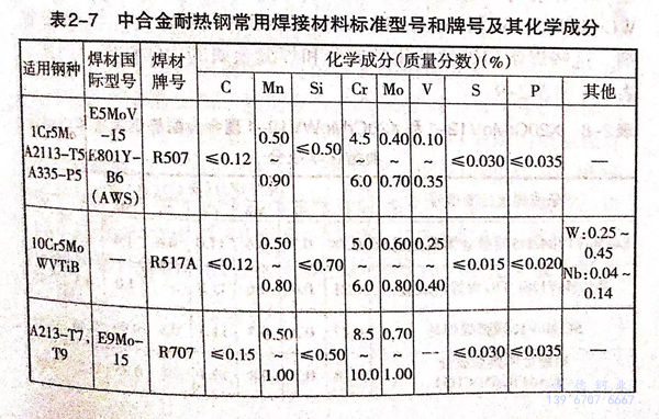 中合金耐熱鋼焊接材料在我國至今尚未標準化。在國外,大部分鉻鋼焊材已納入標準。常用的標準型和非標準型中合金耐熱(re)鋼焊接材料型號、牌號及其化學成分列于表2-7。