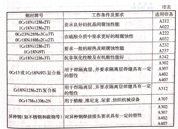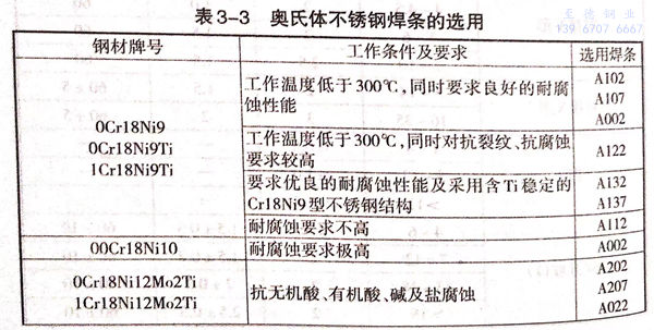 焊條應根據不銹鋼的材質、工作條件(包括工作濕度和接觸介質等)來選用,鉻鎳奧氏體不銹鋼焊條的選用見表3-3。