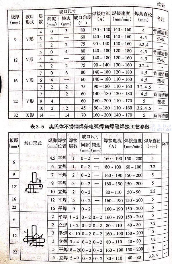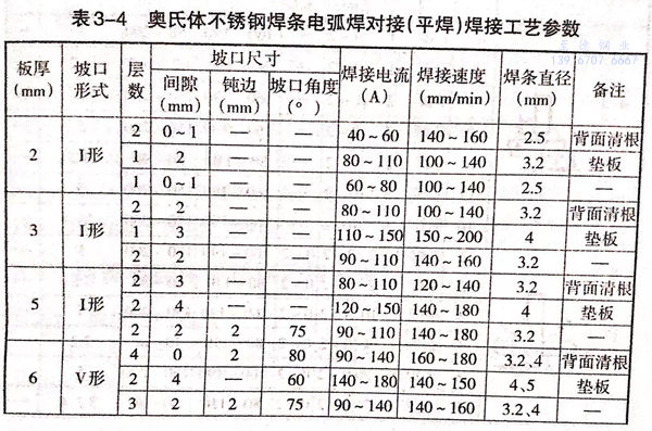奧(ao)氏體(ti)不銹鋼焊(han)(han)條電弧(hu)焊(han)(han)對(dui)接焊(han)(han)縫及角焊(han)(han)焊(han)(han)縫焊(han)(han)接工藝參數見表 3-4 和 表 3-5。