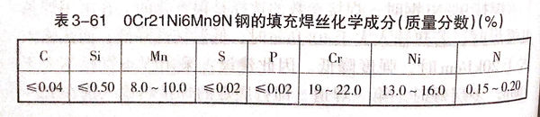 目前,0Cr21Ni6Mn9N鋼的焊接還僅限于TIG焊及真空電子束焊接。焊接參數可參照不銹鋼。填充焊絲的化學成分見表3-61.焊縫金屬的力學性能見表3-62。