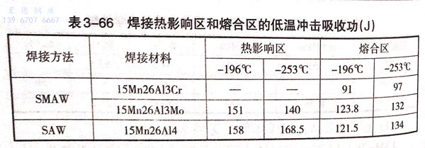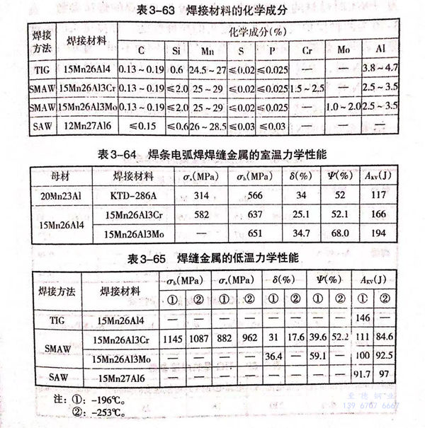 15Mn26Al14鋼可用SWAM、SAW及(ji)TIG方法焊接,其所用焊接材料及(ji)力學(xue)性能(neng)在(zai)表(biao)3-63~表(biao)3-66中給(gei)出。