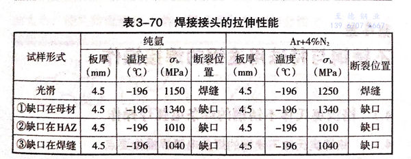 采(cai)用TIG焊(han)(han)法,保(bao)(bao)護氣(qi)(qi)(qi)(qi)體用純氬氣(qi)(qi)(qi)(qi)或(huo)氬氣(qi)(qi)(qi)(qi)+氮氣(qi)(qi)(qi)(qi),填充(chong)(chong)焊(han)(han)絲直徑(jing)4mm.母材及(ji)焊(han)(han)縫金(jin)(jin)(jin)屬(shu)的(de)化學成(cheng)分(fen)在(zai)表(biao)(biao)3-67中給(gei)出。表(biao)(biao)3-68為(wei)-196℃時母材的(de)力學性能(neng)。表(biao)(biao)3-69為(wei)TIG焊(han)(han)的(de)焊(han)(han)接(jie)參數(shu)。表(biao)(biao)3-70為(wei)兩種保(bao)(bao)護氣(qi)(qi)(qi)(qi)體下焊(han)(han)接(jie)接(jie)頭的(de)拉伸性能(neng)。焊(han)(han)接(jie)接(jie)頭的(de)硬(ying)度(du)測定表(biao)(biao)明(ming),焊(han)(han)縫金(jin)(jin)(jin)屬(shu)的(de)硬(ying)度(du)因保(bao)(bao)護氣(qi)(qi)(qi)(qi)體不(bu)(bu)同(tong)而不(bu)(bu)同(tong)。保(bao)(bao)護氣(qi)(qi)(qi)(qi)體為(wei)Ar+8%N2時,焊(han)(han)縫金(jin)(jin)(jin)屬(shu)的(de)硬(ying)度(du)比Ar+4%N2作為(wei)保(bao)(bao)護氣(qi)(qi)(qi)(qi)體時高;而Ar+4%N2作為(wei)保(bao)(bao)護氣(qi)(qi)(qi)(qi)體時,焊(han)(han)縫金(jin)(jin)(jin)屬(shu)的(de)硬(ying)度(du)又高于純氬作為(wei)保(bao)(bao)護氣(qi)(qi)(qi)(qi)體焊(han)(han)接(jie)時的(de)焊(han)(han)縫金(jin)(jin)(jin)屬(shu)硬(ying)度(du)。焊(han)(han)縫金(jin)(jin)(jin)屬(shu)的(de)組織都是純奧氏體,這一結果充(chong)(chong)分(fen)說明(ming)N的(de)強(qiang)化作用。