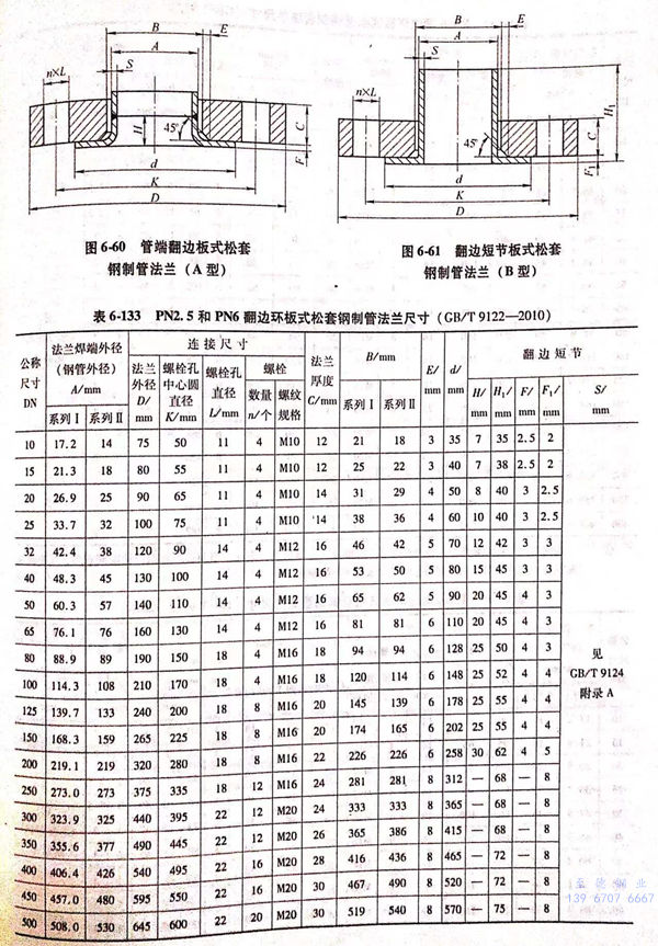 翻邊(bian)環板式松(song)(song)套(tao)法(fa)蘭包括用PN標記(ji)的管端翻邊(bian)板式松(song)(song)套(tao)鋼(gang)制管法(fa)蘭(A型)和(he)翻邊(bian)短節(jie)板式松(song)(song)套(tao)鋼(gang)制管法(fa)蘭(B型)兩類,其密(mi)封面型式及適用的公稱壓力和(he)公稱尺寸(cun)范圍見(jian)表(biao)6-132;用PN標記(ji)的翻邊(bian)環板式松(song)(song)套(tao)鋼(gang)制管法(fa)蘭的型式如圖6-60~圖6-61所示,法(fa)蘭結構尺寸(cun)或(huo)尺寸(cun)見(jian)表(biao)6-133~表(biao)6-135。