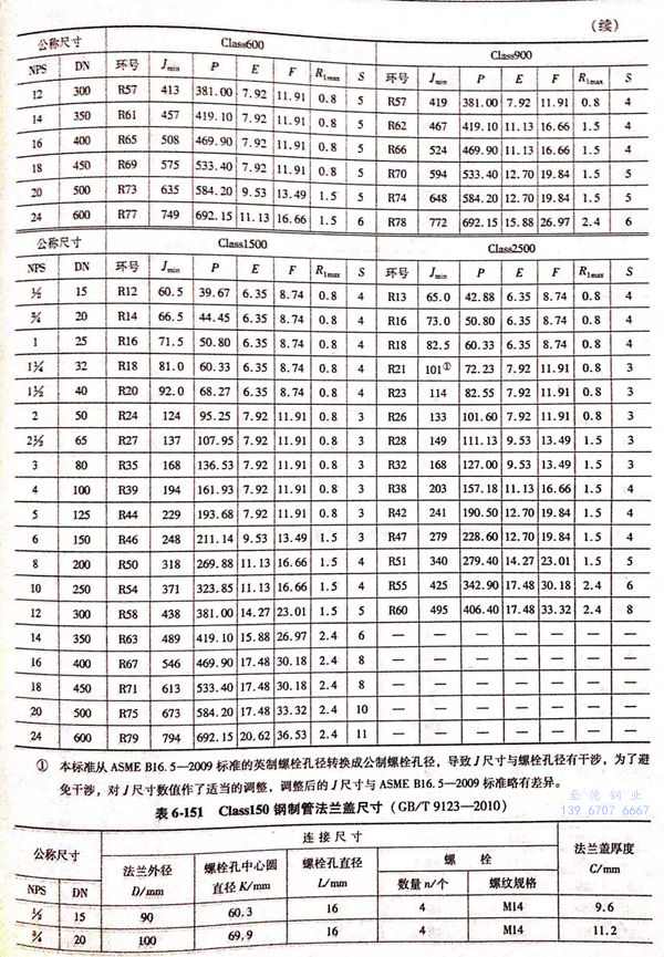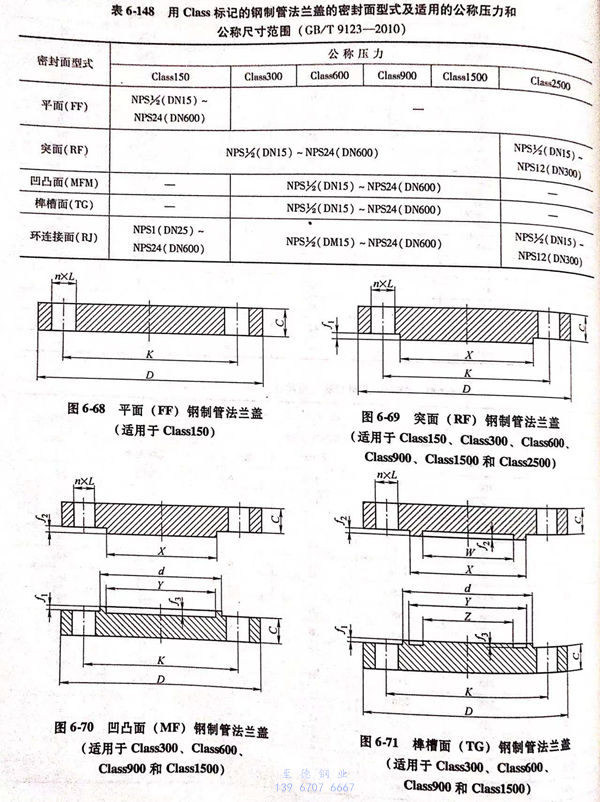 用Class標記的(de)鋼制(zhi)(zhi)管法蘭(lan)蓋(gai)的(de)密封(feng)面型式及(ji)適用的(de)公稱(cheng)壓力和公稱(cheng)尺寸范圍見表(biao)6-148;用Class 標記的(de)鋼制(zhi)(zhi)管法蘭(lan)蓋(gai)的(de)型式如圖(tu)6-68~圖(tu)6-72所(suo)示,密封(feng)面尺寸見表(biao)6-149~表(biao)6-150,法蘭(lan)結構尺寸見表(biao)6-151~表(biao)6-156。