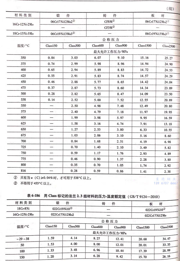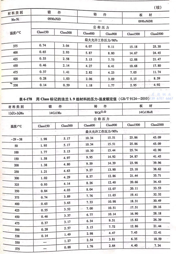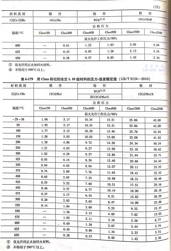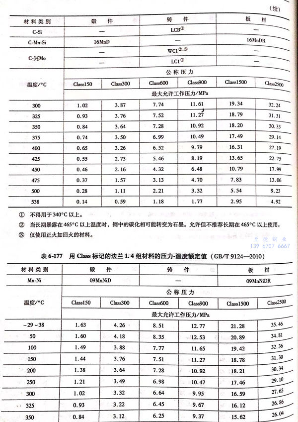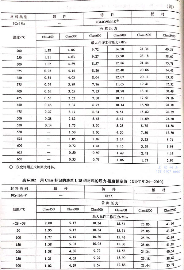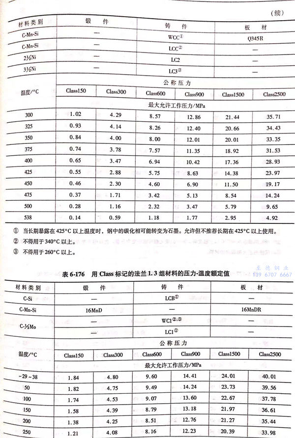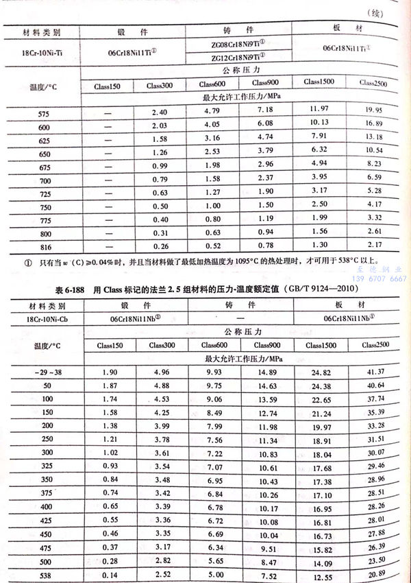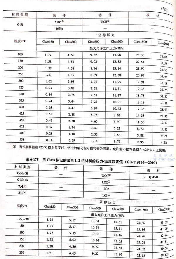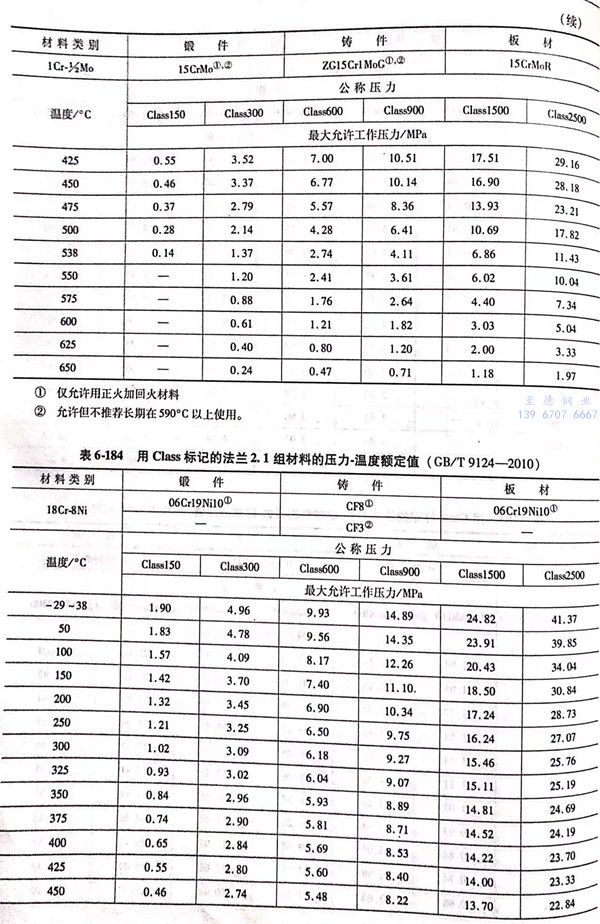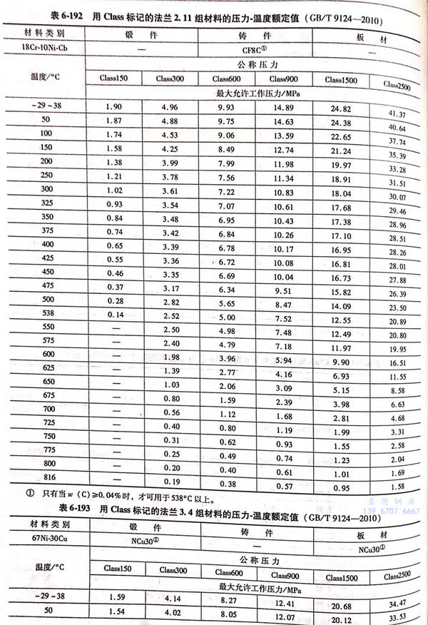 用 Class標記的(de)(de)法(fa)蘭壓(ya)力-溫度(du)(du)額(e)定(ding)(ding)值(zhi)見(jian)表(biao)(biao)6-173~表(biao)(biao)6-193;用Class標記法(fa)蘭的(de)(de)壓(ya)力-溫度(du)(du)極限額(e)定(ding)(ding)值(zhi)見(jian)表(biao)(biao)6-194.表(biao)(biao)6-173~表(biao)(biao)6-193所定(ding)(ding)的(de)(de)法(fa)蘭壓(ya)力-溫度(du)(du)額(e)定(ding)(ding)值(zhi)不得超(chao)過(guo)表(biao)(biao)6-194規定(ding)(ding)的(de)(de)極限額(e)定(ding)(ding)值(zhi)。