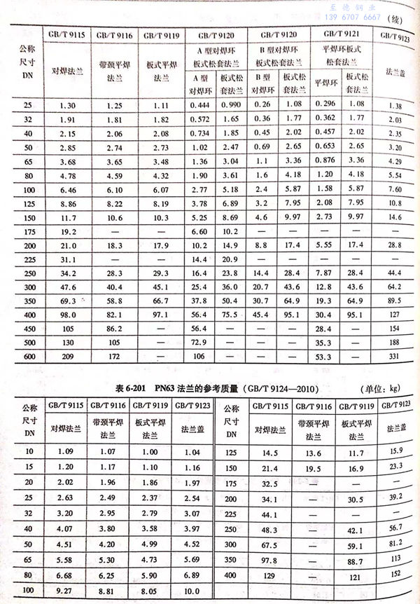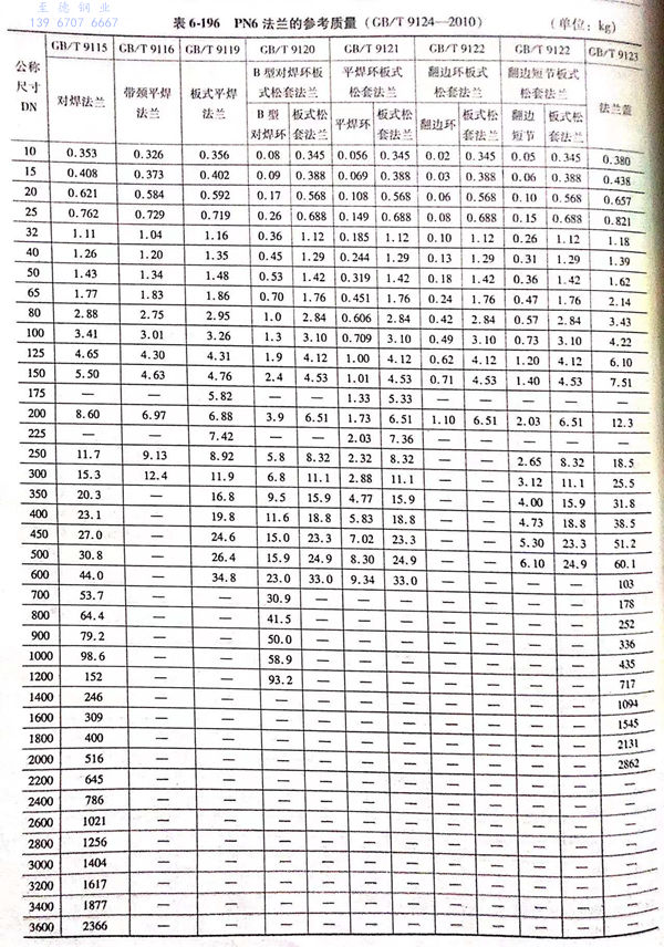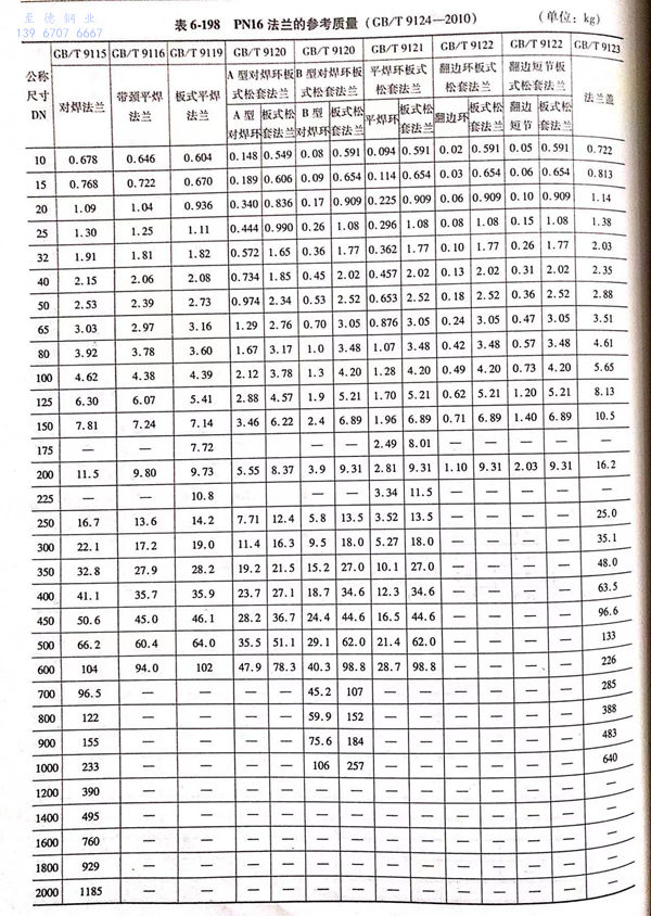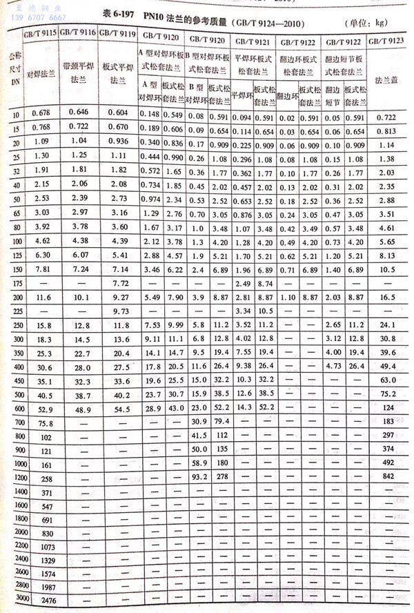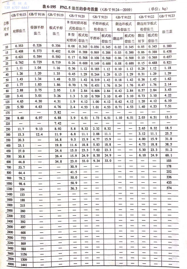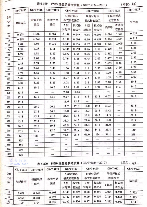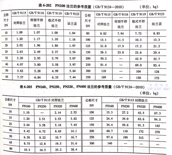 用PN標記的(de)法蘭(包括PN2.5~PN400共12個(ge)壓力級的(de)法蘭)的(de)參考質(zhi)量見表6-195~表6-203。
