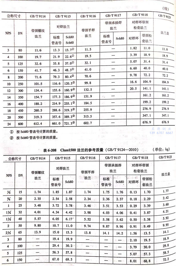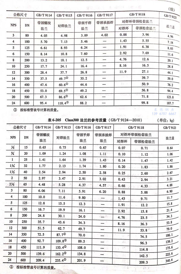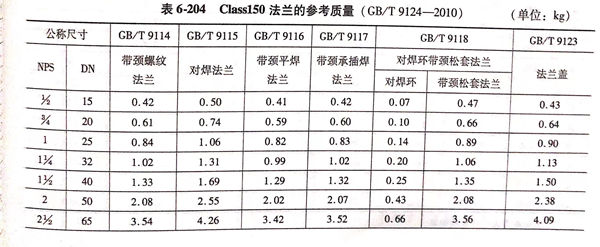 用 Class 標記的(de)法蘭(lan)(包括 Class 150 ~ Class 2500 共6個壓力級(ji)的(de)法蘭(lan))的(de)參考質量見(jian)表(biao)6-204~表(biao)6-209。