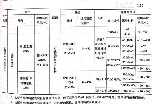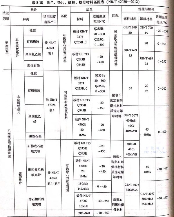 甲型平(ping)焊(han)法(fa)蘭(lan)(lan)、乙型平(ping)焊(han)法(fa)蘭(lan)(lan)和(he)長頸(jing)對焊(han)法(fa)蘭(lan)(lan)(以下簡稱甲型、乙型、長頸(jing)法(fa)蘭(lan)(lan))與墊片、螺柱與螺母材(cai)料的(de)匹配(含(han)適用溫(wen)度范(fan)圍)見表8-18。