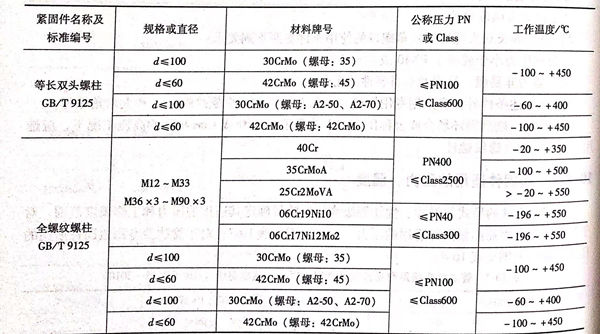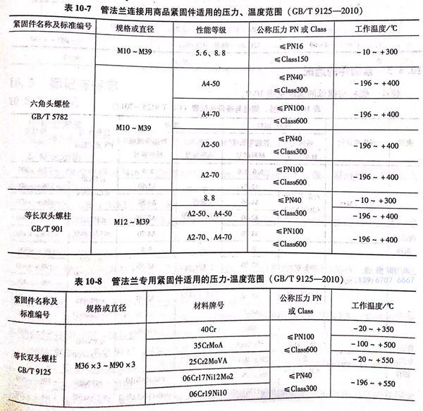 根據(ju)緊固(gu)件(jian)的型式與尺(chi)寸、性能等級或材料牌號確定其(qi)適用的壓(ya)(ya)力(li)和工作(zuo)溫度(du)范(fan)圍(wei)。對(dui)于管法(fa)蘭(lan)連接用商(shang)品緊固(gu)件(jian)適用的壓(ya)(ya)力(li)、溫度(du)范(fan)圍(wei)見(jian)表(biao)10-7;對(dui)于管法(fa)蘭(lan)專(zhuan)用緊固(gu)件(jian)適用的壓(ya)(ya)力(li)、溫度(du)范(fan)圍(wei)見(jian)表(biao)10-8.